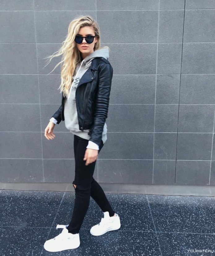 Кожаная куртка и белые кроссовки