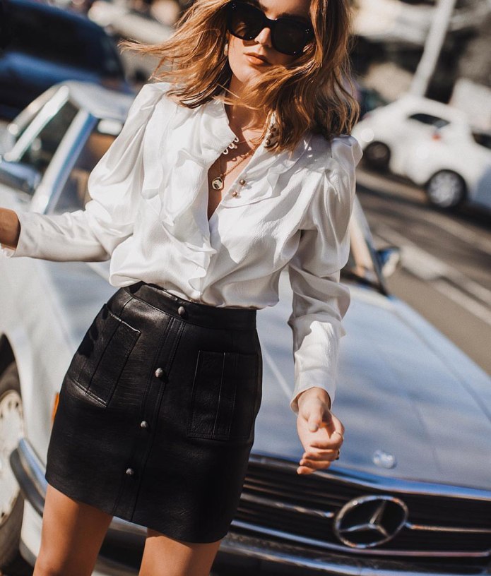 Кожаная юбка с белой блузкой