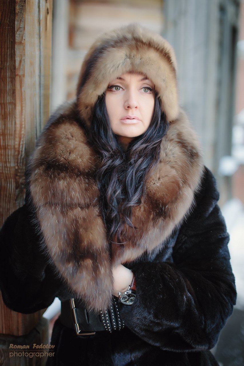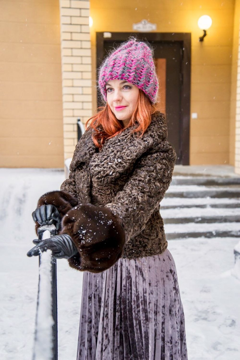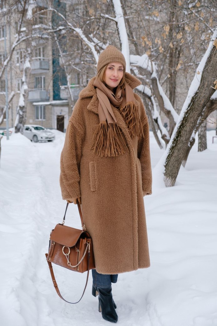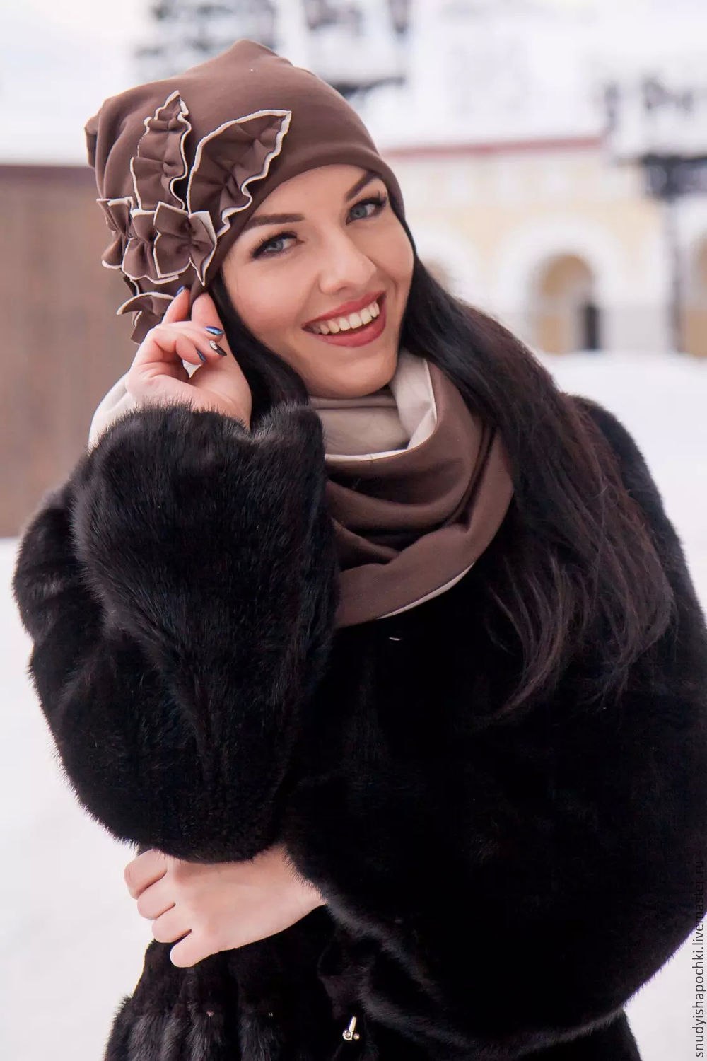 Коричневая шуба и синяя шапка женская