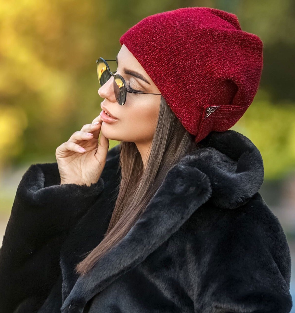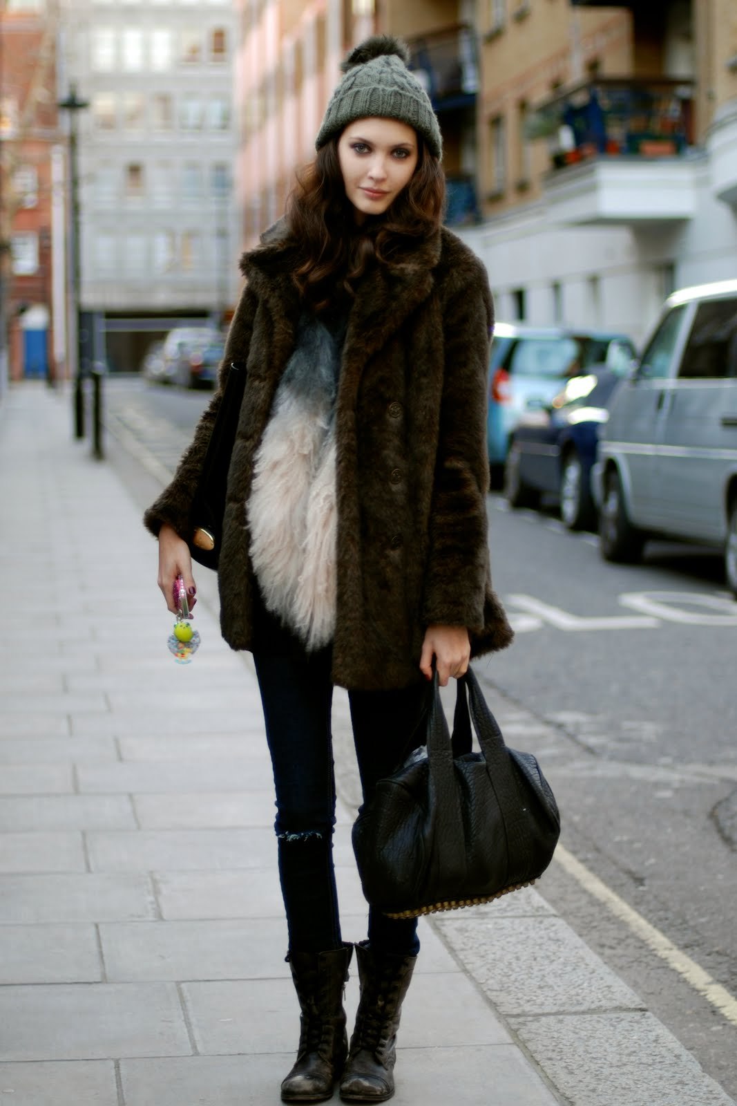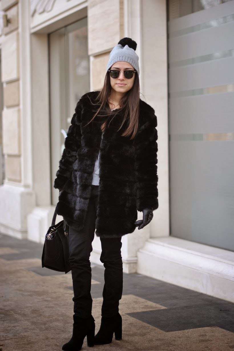 Коричневая шуба и синяя шапка женская